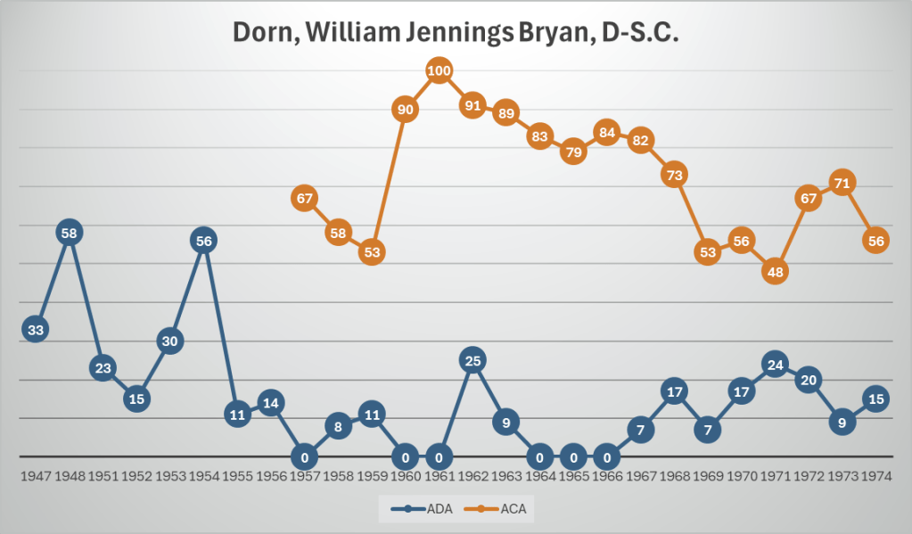 A preview of Congressman Dorn’s changes came in 1968, when he supported an open-ended appropriation for food stamps. Although this change is not nearly as represented in Americans for Democratic Action’s (ADA) ratings as opposed to Americans for Constitutional Action’s (ACA) ratings, these came in the form of how he addressed social programs and even civil rights. In 1969, Dorn opposed a conservative substitute to extending the Federal Elementary and Secondary Education Act, which he had opposed only four years before. In 1970, Dorn was the only South Carolina representative to vote for a bill for federal aid for desegregation. This absolutely floored his colleagues, especially when one considers that in other ways Dorn’s record remained in his old ways. For instance, he opposed extending the Voting Rights Act in 1970 and continued to oppose funding for the Civil Rights Commission. Dorn was also the only South Carolina representative to vote against the Equal Rights Amendment in 1971. However, he also voted against another amendment that proved even more surprising; he was also the only South Carolina representative to vote against a school prayer amendment that same year. Dorn also voted against several legislative efforts to curb busing as a means for desegregation, including Rep. Broomfield’s (R-Mich.) and Rep. Ashbrook’s (R-Ohio) 1971 proposals. Although in 1969 Dorn had supported transferring anti-poverty functions to the states, he supported extending such programs despite President Nixon’s opposition to the bill for the level of spending and for containing a provision for government daycare. He also opposed a Republican substitute to anti-poverty legislation which had a simple extension with no funding increases or government daycare program or legal services corporation the following year. The reason, however, that ADA found him still pretty conservative while ACA found him considerably less so was due to his staunchly pro-military voting record. Dorn constantly opposed defense cuts and was always supportive of President Nixon on the Vietnam War. He also voted against the War Powers Act of 1973, which was passed over President Nixon’s veto. ADA placed considerably more weight on military issues than ACA, which although far from neglectful of military spending and Vietnam, placed more weight on issues of spending and government expansion. Dorn was furthermore an advocate for veterans, and thus was well suited for his time as chairman of the Veterans’ Affairs Committee from 1973 to 1974. In 1974, Dorn opted against another term in Congress to run for governor. This certainly seemed like a good idea, after all Republicans were being dragged down by Watergate. However, South Carolina defied this trend with the election of Republican Governor James Edwards. Dorn had sided with ADA 15% of the time during his time in Congress, ACA 72% of the time, and his DW-Nominate score is -0.017. None of these criterion really reflect the notion that Dorn was a “progressive populist” as South Carolina Encyclopedia’s profile depicts him in his later career (Moore). Sure, he became a bit more liberal, but his ACA agreement never fell below 48% and he never agreed with ADA more than 58% of the time in a given year. Although DW-Nominate’s score does not look conservative at all, bear in mind that party-line procedural votes get counted and that his score is higher than any Democrat serving nationally. Dorn tried again for governor in 1978, but lost the Democratic primary. From 1980 to 1984, he did one last service for his party by serving as the chairman of the state’s Democratic Party. Perhaps aside from the shifts in his record, the most interesting thing about Dorn is that his portrayal seems a bit different from reality.